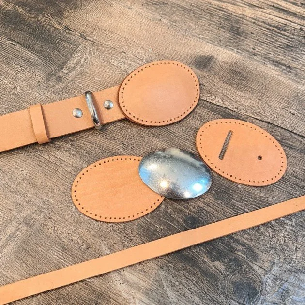 The belt you'll be making has a jeans/western-style buckle (as shown in the photos above)
